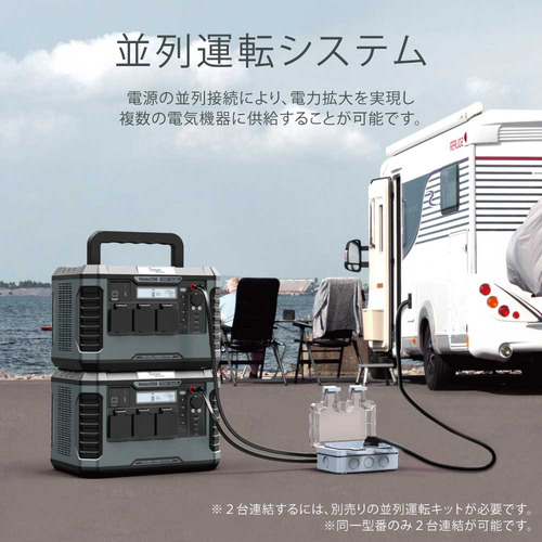 複数の家電製品に供給することを想定し、Masterは独自開発したインバーター技術を手段とし、同じ電源を並列に接続すると、電力倍増し給電できます。(例)2200W電源を2台並列して、合計4400Wになる電力の倍増と容量拡張を実現させ、互換性を向上させます。キッチン、エアコン、電動工具など、より多くの機器を簡単にサポートできます。※並列ジョイント機器は別売りとなります。