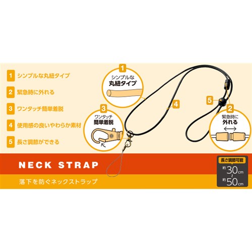 ●首に装着してスマートフォンの落下を防ぐ、ネックストラップです。装着時にスッキリ目立たないレザー調細紐タイプです。