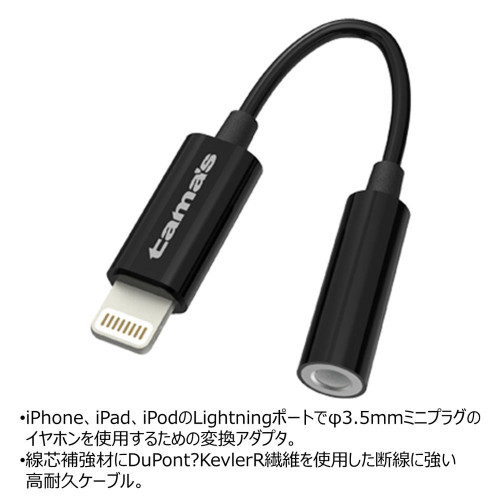 ●防弾チョッキにも使われる米国デュポン社のケブラー繊維を用いて芯線の強度を高め、曲げや引っ張りに対し、高い強度と耐久性を実現。●ハンズフリー通話対応。イヤホンマイクを使用すればイヤホンのコントロールスイッチで着信応答・通話ができます。また、MFi認証のイヤホンマイクでは選局・音量調整にも対応