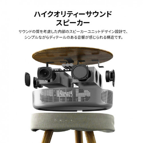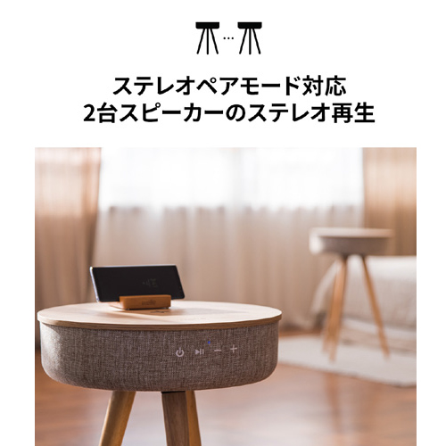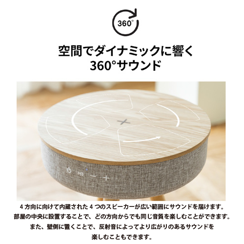 高性能スピーカーとサイドテーブルを一体化させた革新的な商品です。高出力のリッチなサウンドが360°に広がり、