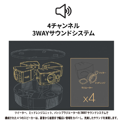 4方向に向けて内蔵された4つのスピーカーが広い範囲にサウンドを届けます。