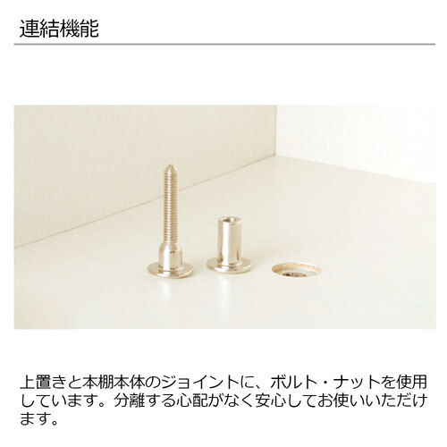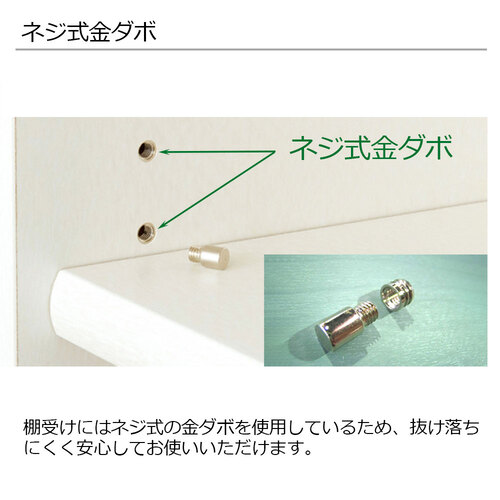 ●棚受けにはネジ式の金ダボを使用しているため、抜け落ちにくく安心です。オプション引き出し(別売り)も、しっかりと支えます。