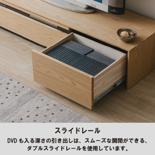 DVDも入る深さの引出しは、スムーズな展開ができる、ダブルスライドレールを使用しています。