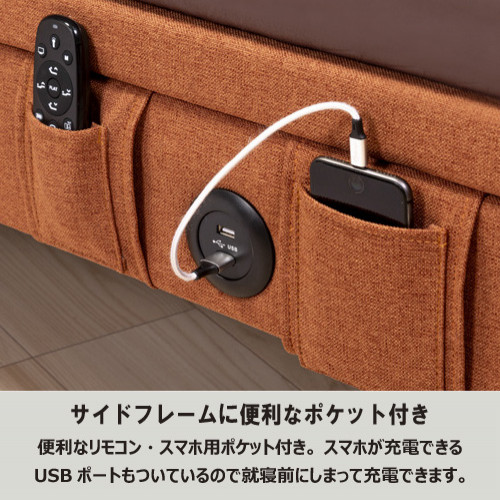 サイドフレームには便利なリモコン、スマホ用ポケット付き。就寝時にスマートに収納できます。