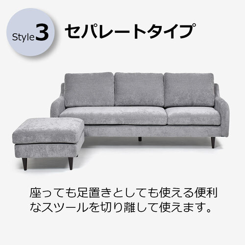 座クッションを入れ替えるだけの簡単な作業で、カウチの向きを変えたり、3人掛けとオットマンに分けることができます。