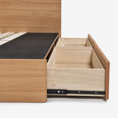 引出し内部は桐材を使用しています。ベッドフレーム内にこもりがちな湿気から大切な衣類を守ってくれます。引出しの位置は左右どちらにも取り付けが可能です。