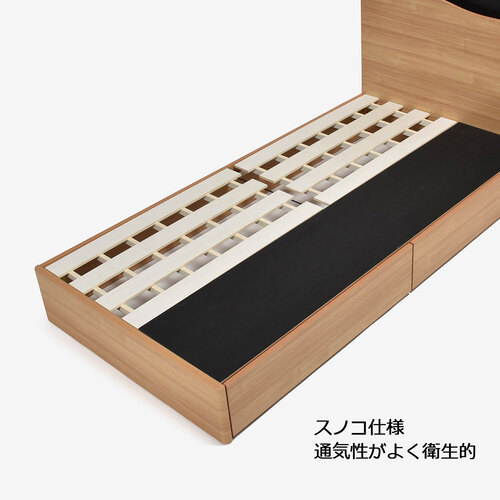 引出し内部は桐材を使用しています。ベッドフレーム内にこもりがちな湿気から大切な衣類を守ってくれます。引出しの位置は左右どちらにも取り付けが可能です。