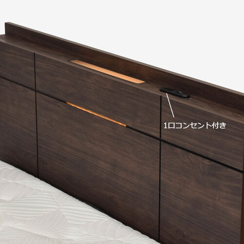 シンプルなLED照明付き宮付きタイプのヘッドボードです。照明をつけた時に中央のスリットからわずかに漏れる灯りが、デザインのアクセントになっています。※マットレスは別売りです。