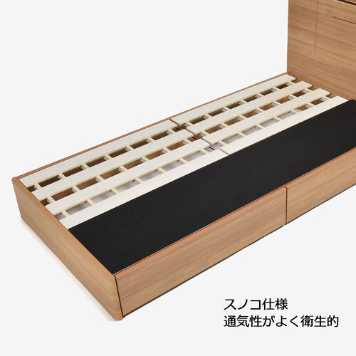 引出し内部は桐材を使用しています。ベッドフレーム内にこもりがちな湿気から大切な衣類を守ってくれます。引出しは左右どちらにも取り付けが可能です。