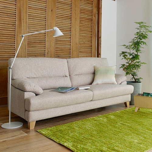 ●リーズナブルな価格が魅力のミドルバックの背もたれとローワイドの肘かけでゆったりくつろげる大塚家具オリジナルソファ。