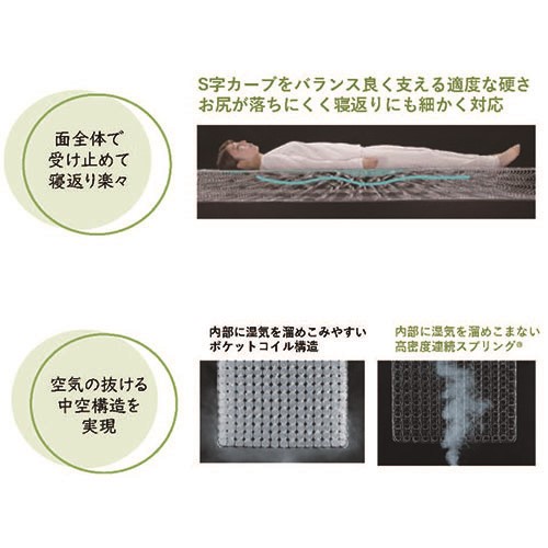 ポリエステル三次元スプリング構造体が、高い弾力性で寝姿勢を保ちます。