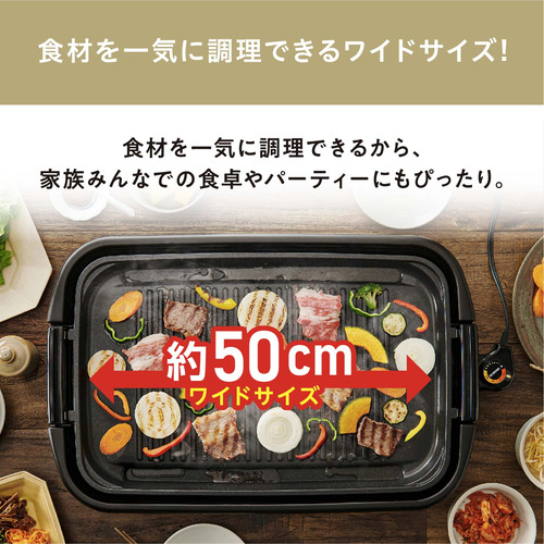 調理面の幅が50cmのワイドプレートで、一度にたくさん焼けるワイドホットプレートです。