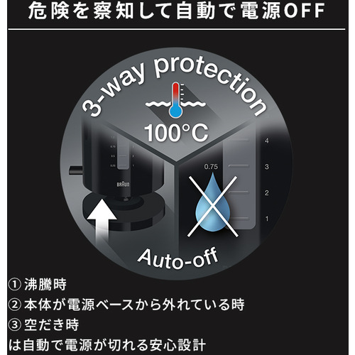 沸騰時、空だき時、電源ベースからケトルが外れた時は、安全のため自動電源オフ機能が働きます。