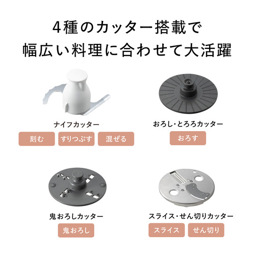 刻む・すりつぶす・混ぜる・おろす・鬼おろし・スライス・せん切りまで、下ごしらえがはかどる。時間と手間を賢く省いて、料理に合わせて大活躍。