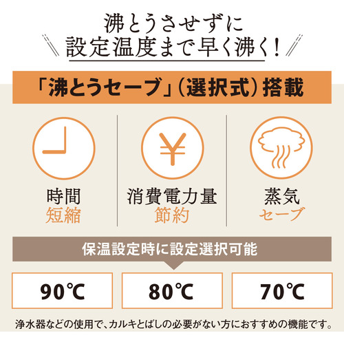 沸とうさせずに設定した温度まで沸かして保温するから、湯沸かし時間、消費電力量、蒸気の発生を抑えられます。(浄水器などの使用で、カルキとばしの必要がない方におすすめの機能です。)