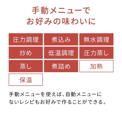 調理:圧力調理、煮込み、無水調理、低温調理