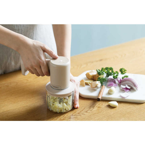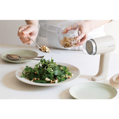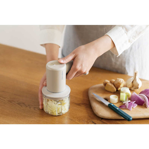 ●超お手軽なコードレスのホイッパー&チョッパーコードレスだから場所を選ばず使えます。にんにくやしょうがなどの少量の薬味が、手軽に刻めます。従来のハンドミキサーに比べて、軽量の約300g。タッチセンサー式で操作もスマートです。高速・低速・パルス(1秒ON⇔1秒OFF)の3つのモードを搭載。食材に合わせて使用するモードを選べます。USBCタイプの充電式。約2.5時間のフル充電で約15回(Hiチョッパー使用時/食材によって異なります。)使用可能。(Hi ビーター使用時は約20回)