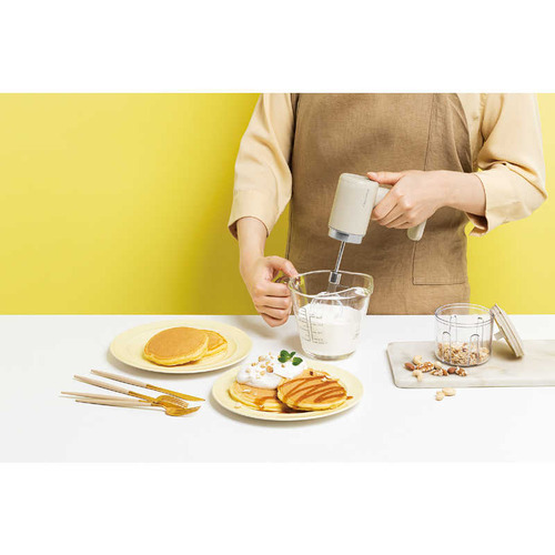●ちょこっと使いたい時に便利なパーツビーター:泡立て用のパーツ。計量カップに入るコンパクトなビーターです。生クリームや卵白、温めたミルクも泡立てられます。手作りドレッシングの撹拌にも。1回の使用目安:生クリーム200ml以下、卵白1〜2個分チョッパー:みじん切り用のパーツ。トッピング用の薬味やナッツなど、手軽にみじん切りにできます。にんにくひとかけ分からみじん切りが可能。ステンレスの3枚ブレードで長ねぎやみょうが、ナッツ類も刻めます。カップの中で完結するから、散らからず便利。容量はMax160ml。