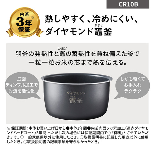 内釜:ダイヤモンド竃(かまど)釜、底面ディンプル(3列)、遠赤ダイヤモンドハードコート(3年保証(※保証期間:本体お買い上げ日から ●本体1年間 ●内釜内面フッ素加工(遠赤ダイヤモンドハードコート)3年間 *ただし次の場合には保証期間内でも「有料」とさせていただきます。・一般家庭用以外に使用したとき・取扱説明書に記載した用途以外に使用したとき・取扱説明書の記載事項を守らなかったとき※))、外面60μm(黒色)、釜厚約2.2mm
