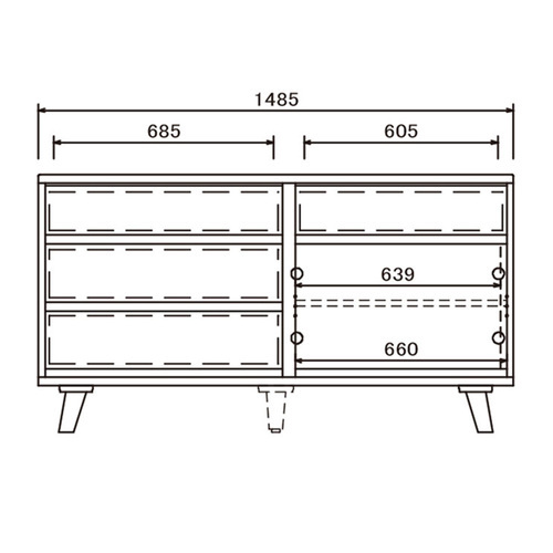 材質:天板、側面、上2段引出しルーバー部分:強化紙(オーク柄) 前板:ホワイトオーク突板 引出し:桐無垢材(床板はシート張り合板) 脚部:ラバー材