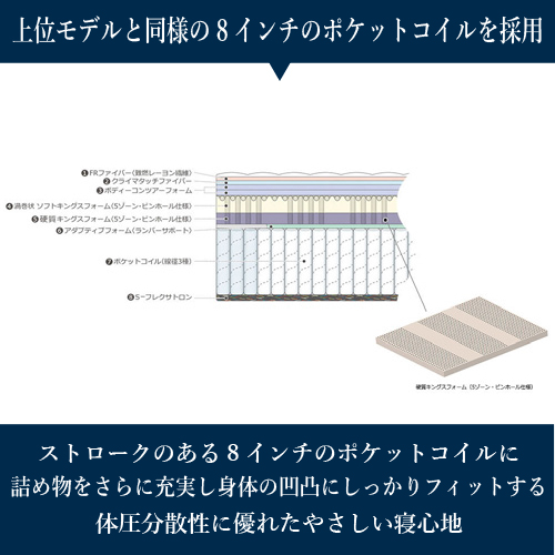 上位モデルと同仕様の贅沢な8インチのポケットコイルを採用。ストロークが長いポケットコイルは、身体の凹凸はもちろん横向き寝の大きなS字ラインにもしっかりフィット。優れた体圧分散性を発揮し、やさしい寝心地に仕上がっています。