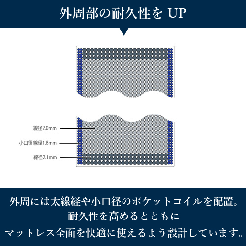 型崩れしやすいマットレス外周には太線経や小口径のポケットコイルを配置して耐久性を高めるとともに、マットレス全面を快適に使えるよう設計しています。