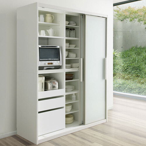 収納しているものを程よく隠せる引き戸タイプのキッチンボードはキッチンをすっきりと見せてくれます。ホワイトは明るい印象で圧迫感少なくお使いいただけます。