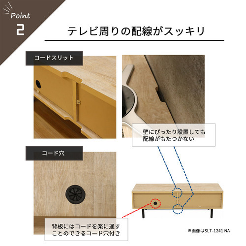 背板には配線孔付き。壁にぴったり設置しても配線がもたつかないコードスリット付き。