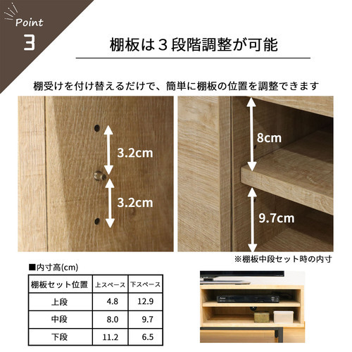 オープン部の棚板は3段階に高さ調整可能(3.2cm間隔)。
