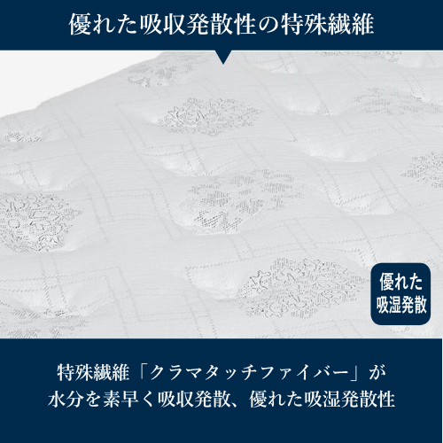 ●アメリカのサニタイズ社が全世界に特許を持つ抗菌加工処理法「サニタイズ加工」を表面生地に施しました。抗菌防臭、吸放湿効果でマットレスを清潔に保ちます。