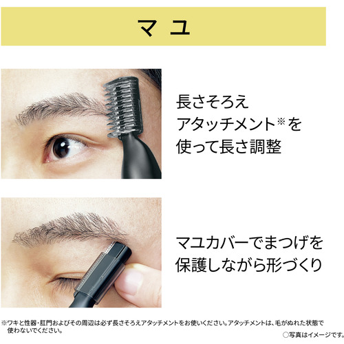 ●ヒゲ・マユ・ボディ・VIOを1台でお手入れできる(※ワキと性器・肛門およびその周辺は必ず長さそろえアタッチメントをお使いください。アタッチメントは、毛がぬれた状態で使わないでください。※)