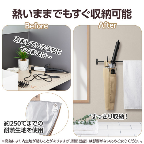 ●耐熱温度が約250度だから、ヘアアイロンが冷めるまで待つ必要がなく、使用した直後でも収納できます。スタイリング中の一時置きにも便利です。