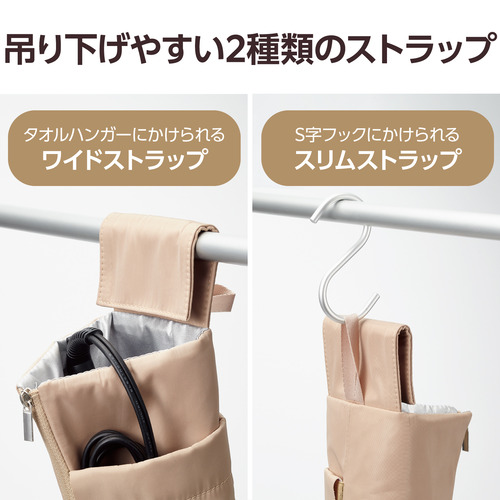 ●洗面所のタオルハンガーにかけられるワイドストラップと、S字フックにかけられるスリムストラップが付いています。