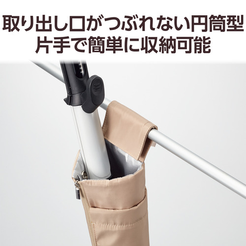 ●円筒型だからつるしている状態でも取り出し口がつぶれず、片手で簡単に収納することができます。