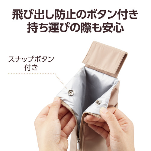 ●取り出し口のスナップボタンを留めるとヘアアイロンの飛び出しを防ぎます。旅行などの持ち運びの際も安心です。