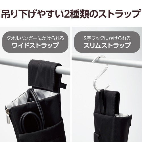 ●アツアツのヘアアイロンをそのまましまえるヘアアイロンホルダーです。髪を巻いたらすぐにしまって即出勤OK。バタバタする毎朝のスタイリングを時短できます。ワイドとスリムの2タイプのストラップで、タオルハンガーやS字フックに吊るすことができ、洗面所でも便利。側面ファスナーを開き洗面台や机に置くと、スタイリング中のヘアアイロンの一時置きにも活躍します。