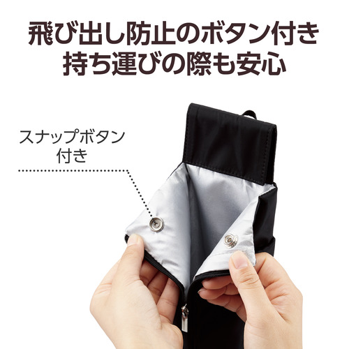 ●取り出し口のスナップボタンを留めるとヘアアイロンの飛び出しを防ぎます。旅行などの持ち運びの際も安心です。