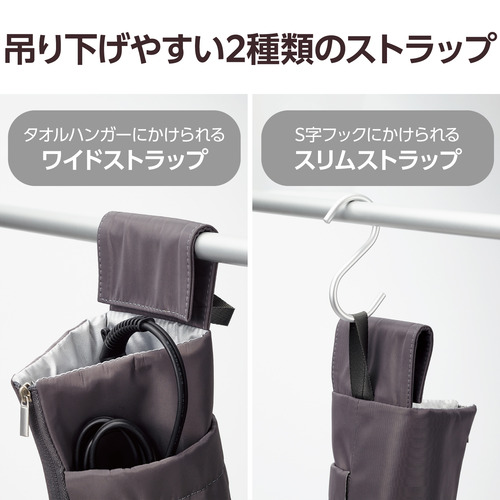 ●洗面所のタオルハンガーにかけられるワイドストラップと、S字フックにかけられるスリムストラップが付いています。
