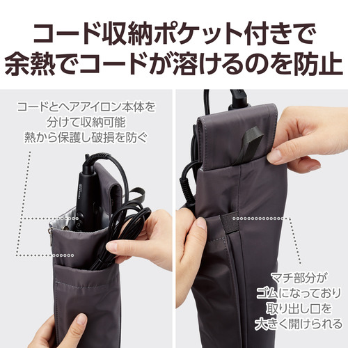 ●コードをヘアアイロン本体と分けて収納できる外ポケット付き。コードを熱から保護し破損を防ぎます。マチ部分がゴムになっているので、取り出し口を大きく開けられてかさばりやすいコードを入れやすい構造です。