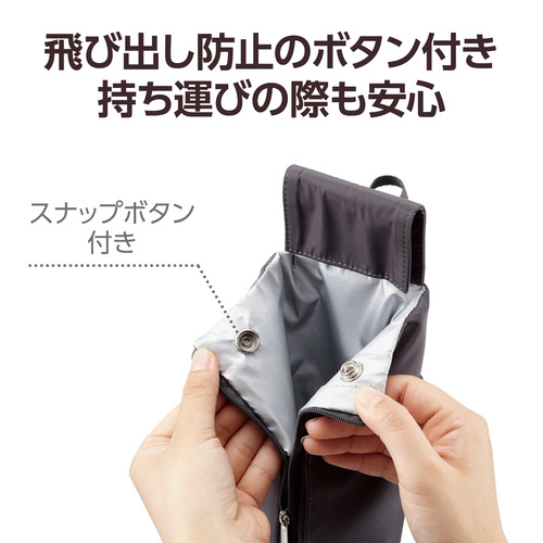 ●取り出し口のスナップボタンを留めるとヘアアイロンの飛び出しを防ぎます。旅行などの持ち運びの際も安心です。