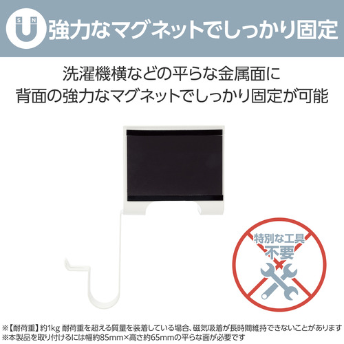 ●ドライヤーの出し入れがしやすくなって、洗面スペースもスッキリ!強力なマグネットで洗濯機などのスチール面に取り付けられるドライヤーホルダーです。折りたたみタイプ・ハンマー型のどちらにも使えます。プラグを固定できるフック付きで、まとめたコードが解けずきれいに収納できます。