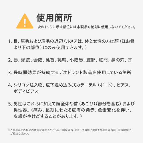顔、ワキ、腕、脚、ビキニライン(V、I)まで幅広くお手入れできます。 これ 1 台で自宅で簡単に気になるムダ毛をケアできます