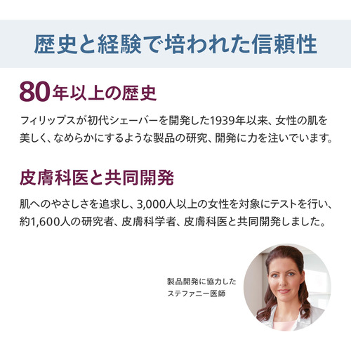 フィリップス ルメア 光美容器 8000 は、世界中で 3,000 人以上の女性を対象 にテストを行い、皮膚科医と共同で開発された光美容器で、顔、からだ、ビキ ニライン(V、I)まで 1 台でムダ毛ケアを可能にします。 長期的効果として、最長で 12 か月なめらかな肌へと導きます。