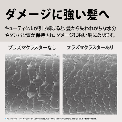水分子に包まれたプラズマクラスターが、髪表面をうるおいコーティング。保湿効果を高め、キューティクルを引き締めます。