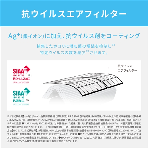 清潔機能:給気・排気換気、Ag+除菌/抗ウイルスミクロメッシュエアフィルター(SIAA認証)、フィルターお掃除ロボット(BOXタイプ)、熱交換器(親水コート/ホコリレスコーティング)、防汚防カビコーティングファン、ナノイーX内部クリーン、においカット、カビみはり(室内機内部/お部屋)、おでかけクリーン、においケア(+ねらって脱臭)