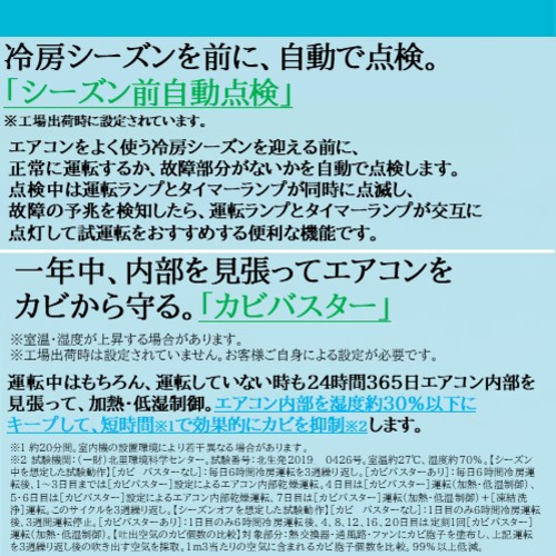 運転中はもちろん、運転していない時も24時間365日エアコン内部を見張って、加熱・低湿制御。エアコン内部を湿度約30%以下にキープして、短時間※1で効果的にカビを抑制※2します。※1約20分間。室内機の設置環境により若干異なる場合があります。 ※2 試験機関:(一財)北里環境科学センター。試験番号:北生発2019_ 0426号。室温約27℃、湿度約70%。【シーズン中を想定した試験動作】[カビバスターなし]:毎日6時間冷房運転を3週繰り返し。[カビバスターあり]:毎日6時間冷房運転後、1〜3日目までは[カビバスター]設定によるエアコン内部乾燥運転。4日目は[カビバスター]運転(加熱・低湿制御)、5・6日目は[カビバスター]設定によるエアコン内部乾燥運転、7日目は[カビバスター]運転(加熱・低湿制御)+[凍結洗浄]運転。このサイクルを3週繰り返し。【シーズンオフを想定した試験動作】[カビバスターなし]:1日目のみ6時間冷房運転後、3週間運転停止。[カビバスターあり]:1日目のみ6時間冷房運転後、4、8、12、16、20日目は定刻1回[カビバスター]運転(加熱・低湿制御)。【吐出空気のカビ個数の比較】対象部分:熱交換器・通風路・ファンにカビ胞子を塗布し、上記運転を3週繰り返し後の吹き出す空気を採取。1m3当たりの空気に含まれるカビ胞子個数を比較。99%以上低減。
