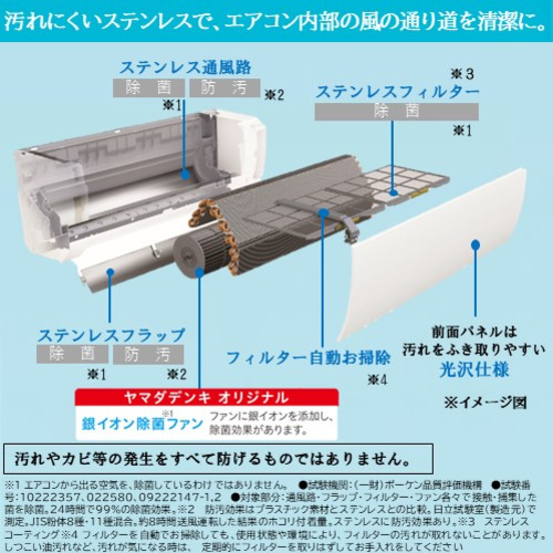 汚れにくいステンレス※4で、エアコン内部の風の通り道を清潔に。ヤマダデンキオリジナル「銀イオン除菌ファン」ファンに銀イオンを添加し、除菌※5効果があります。※4 防汚効果はプラスチック素材とステンレスとの比較。日立試験室(製造元)で測定。JIS粉体8種・11種混合。約8時間送風運転した結果のホコリ付着量。ステンレスに防汚効果あり。※5エアコンから出る空気を、除菌しているわけではありません。●試験機関:(一財)ボーケン品質評価機構 ●試験番号:10222357、022580、09222147-1,2 ●対象部分:通風路・フラップ・フィルター各々で接触・捕集した菌を除菌。24時間で 99%の除菌効果。