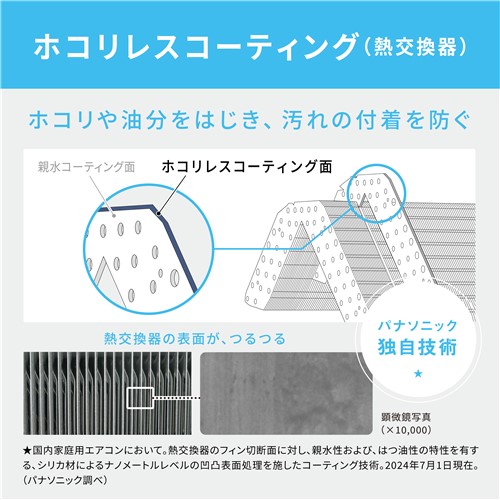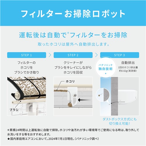 清潔機能:空気清浄フィルター、抗ウイルスエアフィルター、フィルターお掃除ロボット(自動排出/BOX切替)、熱交換器(親水コート/ホコリレスコーティング)、防汚防カビコーティングファン、内部クリーン(カビ菌の除菌)、においカット、カビみはり(室内機内部/お部屋)、においケア