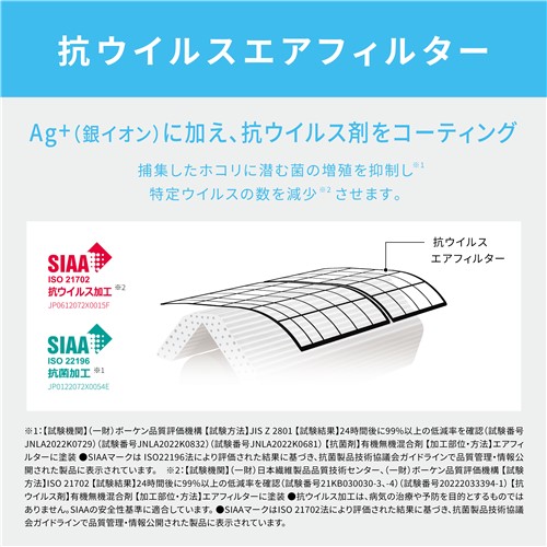 ・ナノイー史上最速で有害物質を抑制(※約8畳空間での〈カビ菌〉約2時間後の抑制効果。約6畳試験空間での〈花粉〉約3時間後、〈ニオイ〉約15分後〈PM2.5〉約12時間後〈アレル物質〉約6時間後、〈浮遊菌〉約4時間後〈付着菌〉約8時間後、〈浮遊ウィルス〉約3.5時間後〈付着ウィルス〉約2時間後の抑制効果です。数値は実際の使用空間での試験結果ではありません。※) ・エアコン内部のカビ菌を除菌(※【試験機関】(一財)北里環境科学センター【試験方法】27.7m3(約6畳)、室温25℃、湿度70%の試験室にて、エアコン内部にカビ菌を滴下した試験片を設置。1日3時間の冷房運転後に「内部クリーン」運転ありとなしの条件において、4日後のカビ菌の数を比較。【試験結果】試験片のカビ菌(1種類)が99%除去されたことを確認(北生発2021_1202号)※) ・抗ウイルスエアフィルター搭載
