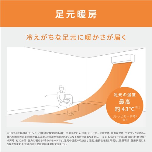 ・外気温ー25℃でも約55℃温風の暖房パワー(※当社測定基準による。CS-UX405D2、当社環境試験室(約14畳)、外気温−15℃、設定温度25℃で安定運転後に、「もっと」設定にて吹き出し口付近の最高温度を確認。風量は暖房定格に対して約50%低下。※)(もっとモード時(※「もっと」モードは、暖房時:約45分間/冷房時:約30分間、強力に暖める/冷やすモードです。足元の温度や吹き出し温度、最長吹き出し時間は、設置環境、使用状況により異なります。AI快適設定時は選択できません。※))・ハイブリッドエネチャージで霜取り運転中も暖房が止まらない(※霜取り運転中は吹き出し温度が下がります。その間の室温の低下度合いは、使用環境(お部屋の断熱・気密性能)、運転条件、温度条件によって異なります。霜の付着量が多くなる環境では、暖房を止めて霜取り運転を行う場合があります。24時間以上の連続運転中、一定時間おきにフィルターお掃除運転が働き、その間、暖房運転を停止します。※)